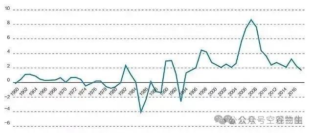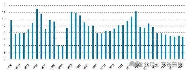 如果公司去某地投资设厂,当地政府可以为它们提供土地,修路造桥,组织劳动力,改变税收制度,甚至可以购买公司生产出的第一批产品。地方政府竭尽所能帮助公司在当地落脚并取得成功。公司只需要牢牢抓住市场机遇。作为交换,公司大量雇佣本土劳工,贡献GDP,并向地方政府支付税收,但从某种意义上说,这更像是支付租金,因为相当于租用了一个现成的公司总部。与此同时,不同的地方政府相互竞争,为商业公司提供更好的服务,和中央政府一起促成了经济的长期增长。从图4中可以看出,多年来中国经济增长率的起伏非常小。这种独特的模式在超长的时间内产生了超高的增长率,且周期性变化非常小。当然周期性变化很小也离不开温和的国际环境和开放的自由交易系统。