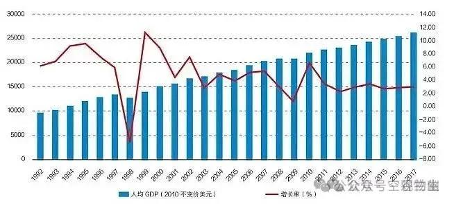 韩国1992—2017年经济增长率及人均GDP(2010不变价美元)