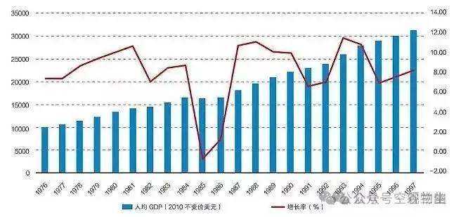 新加坡1976—1997年经济增长率及人均GDP(2010不变价美元)