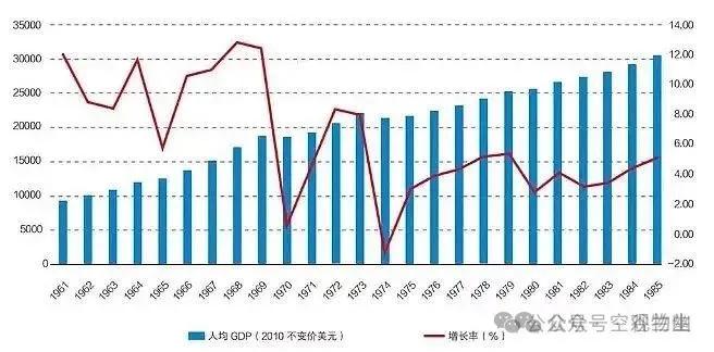 日本1961—1985年经济增长率及人均GDP(2010不变价美元)