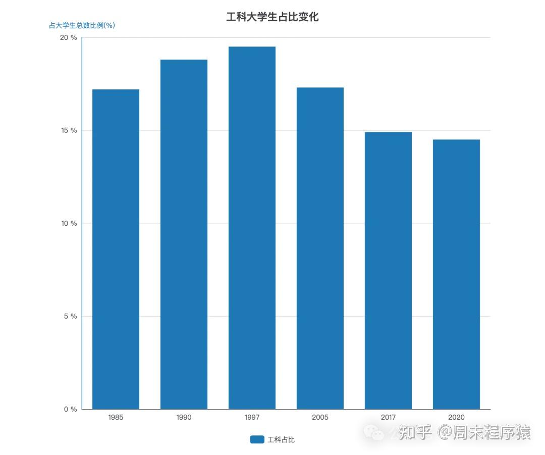 日本文部科学省数据显示,工科大学生总人数从 1990 年至 2019 年降幅超过 40%,工科占比从 1997 年的 19.5% 降至 2017 年的 14.9%。