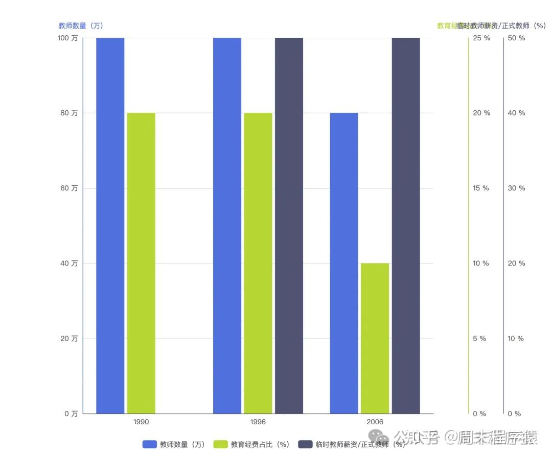 与之相伴的是教育经费的锐减,教育经费占公共支出的比例从 20% 压缩至 10%,这一政策直接影响了教师待遇与工作条件。