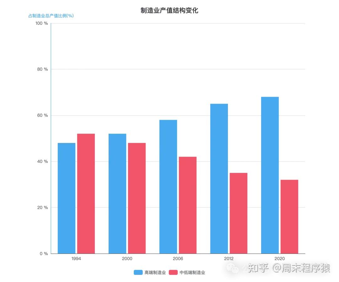 数据显示,理工科毕业生在制造业的就业比例在 1987 年达到顶峰后急剧下降,尽管 1980 年代末经济繁荣带来短暂恢复,但 1992 年仍未回到 1987 年的水平。更值得关注的是产业内部的分化:1994-2012 年间,日本高端制造业占制造业总产值的比例从 48% 增长至 65%,而中低端制造业产值下滑 40%,这种分化意味着即使同为理工科毕业生,进入不同产业领域将面临截然不同的职业前景。