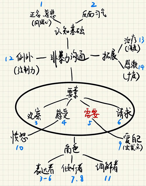 5、观察、感受、需要、请求。非暴力沟通一部分是对这四个要素的清晰表达(不一定用语言),另一部分是从对方的表达中了解这四个要素(深度倾听与提问)。