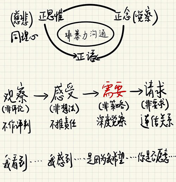 要义:把自我内在冲突转化成对需要的觉察,把对他人的治疗诊断转化为关注需要的非暴力沟通。