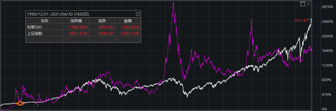 但如果换个思路来看,把上证指数和美国国运指数-标普500拟合到一起看一下,就会发现上证指数1990年末至今涨幅3201.91%,而标普500的同期涨幅1166.56%,看起来还是上证指数更强势。
