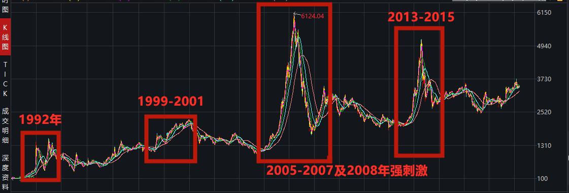 在此之前A股因为正好完成2007年的那轮惨跌,到2008年11月推出四万亿的基建计划,就促成了这轮政策强刺激带来的牛市启动。