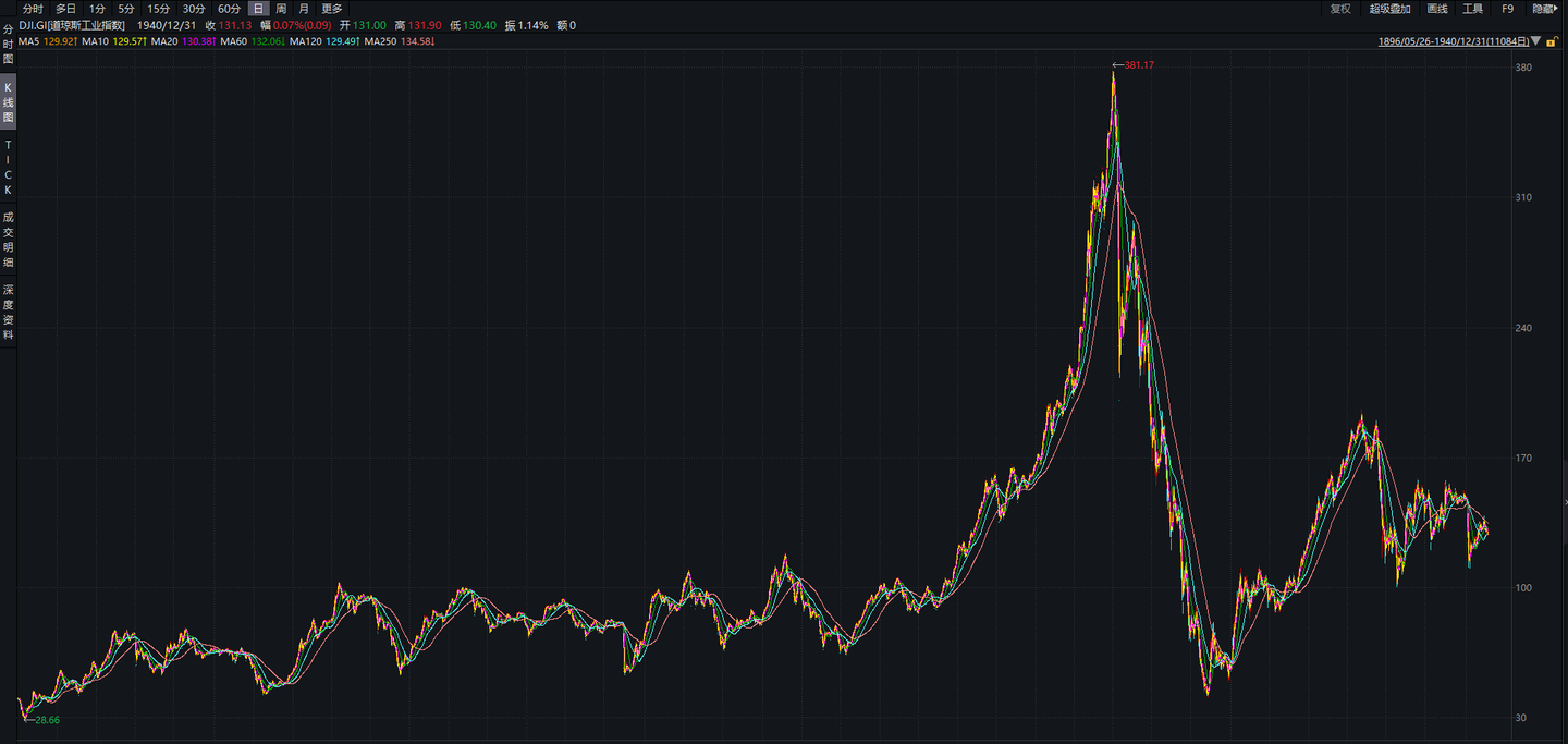 道琼斯工业指数作为美股最早并且一直到现在还作为三大指数被所有投资者关注的重磅指数,从问世之初的1896年5月26日开始到1940年12月31日的走势是这样的:(要选这段时间是因为大作手利弗莫尔就是1940年去世的)