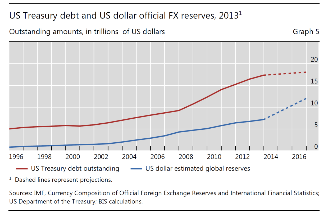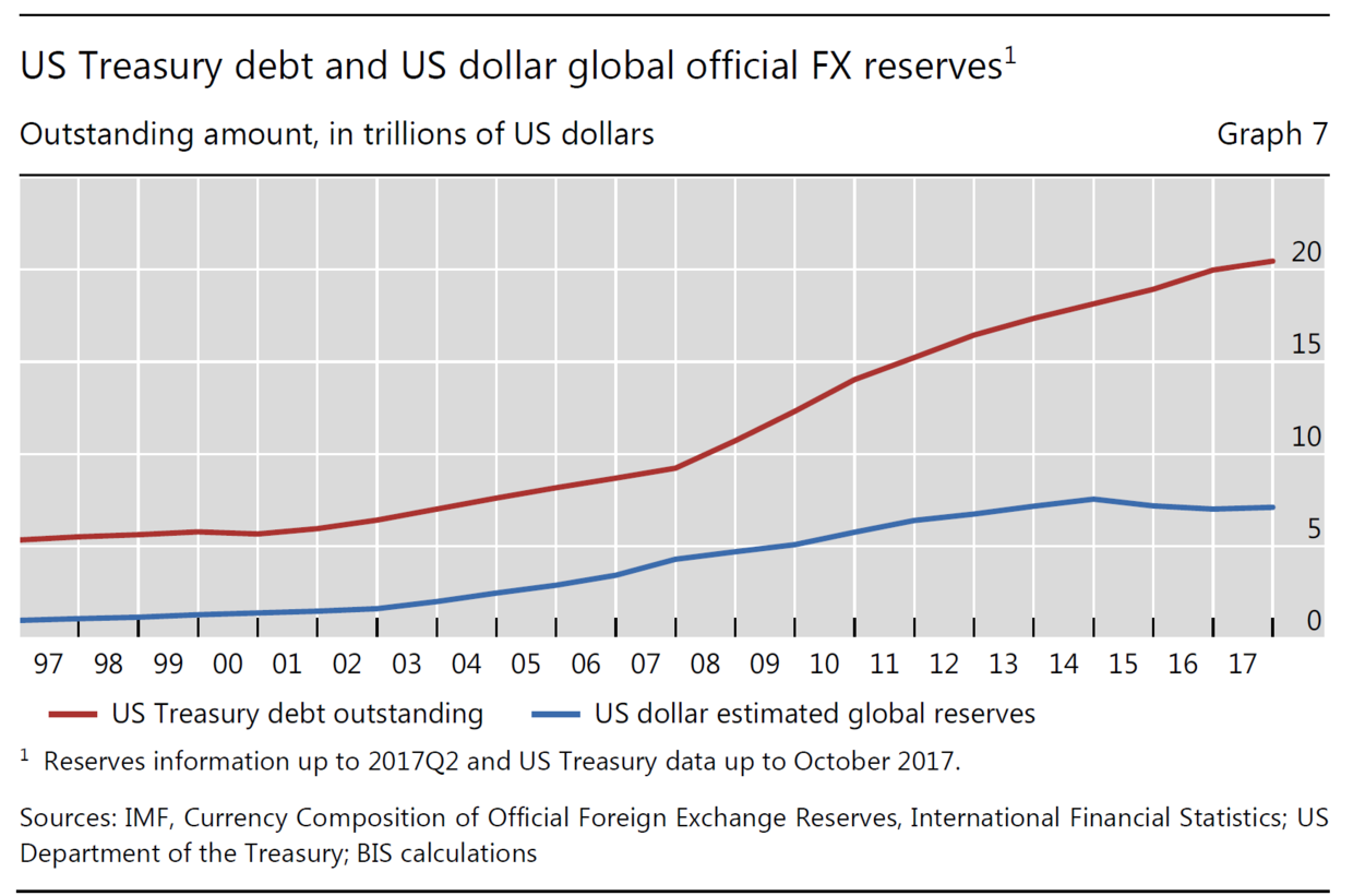 这个论点有两个主要的问题。首先,在国际收支中;我们将在后文分析。其次,它假定只有美国的负债可以提供美元储备。事实上,如上所述,居住在美国以外的借款人广泛使用美元来计价债务,而这些债务又主要由非居民债权人持有。例如,中国的中央银行可以持有一家德国机构的美元债券,这个机构又对新兴市场政府有一定的美元债权。