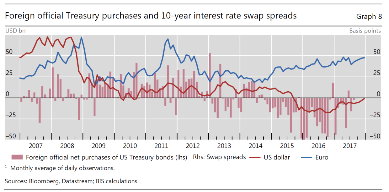 凑巧的是,一个需求端的故事,新兴市场官方储备经理人出售美国国债是美元债券市场上这种怪事最常见的解释之一(Clark and Mann(2016))。随着官方投资者转为美国国债的卖方(图8中零线以下的红色柱线),10年期掉期利率中的一般私人利率与10年期国债之间的价差成了负的。再一次,这与Caballero和Farhi(2013年)预测安全证券与风险证券之间价差的长期扩大(Summers(2016))相反。 (在作者写作时,即使2017年全球外汇储备恢复增长,互换价差也接近于零。)是否存在安全资产的过剩呢?