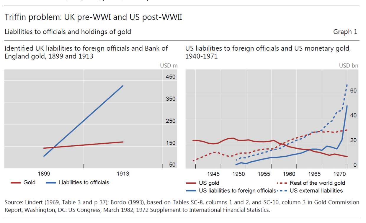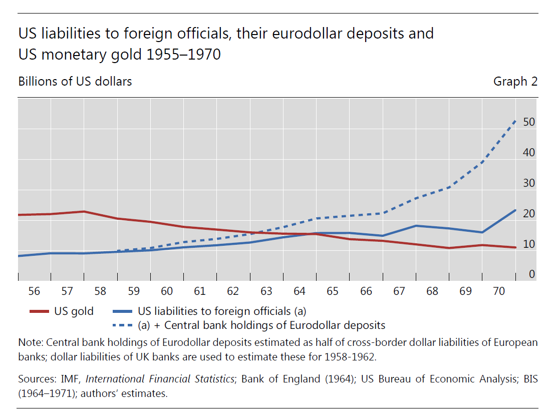 随着布雷顿森林体系在二十世纪五十年代的发展,美元成为了主要的国际储备资产。该体系成为了一个黄金-美元体系,让人联想到两次世界大战期间,英镑和其他货币作为一种补充补足了官方的黄金储备。由于全球黄金储备的增长不足以为世界贸易和产出的增长提供足够的资金,黄金 – 美元体系才得以崛起。这亦是战后对黄金实际价格低估的反馈——低估黄金价格限制了黄金产量。此外,当时的苏联和南非作为黄金供应的主要来源是不太可靠的。全球储备的需求与供给之间的缺口,是由20世纪50年代初对美国官方短期债权的积累——即所产生的美元所填补的。在那个时代,美国在国际官方结算中通过其国际收支赤字积累起对海外的负债,而并未增加官方的资产(比如黄金)。
