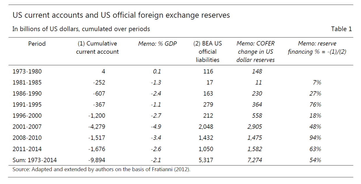 Fratianni总结道:“从布雷顿森林体系到2010年(2014),美国向世界其他地区提供了4.2万亿(5.3万亿)美元的储备资产,平均每年的融资比例为51%[54%]。 “总而言之,美国经常账户赤字的很大一部分来自美元流动性的创造,从而建立了美国的过度开支与世界流动性之间的实证关联”。
