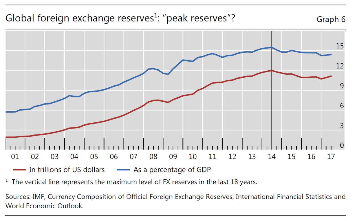 总之,新兴市场经济体的增长需要安全资产的积累,而这些需求必然相较于最终只能随发达经济体增长而增长的供应短缺的观点并没有事实作为支撑。随着2014年美元升值,全球外汇储备减少。而相对应的,代表安全资产需求和供应的两线并不会很快交汇。