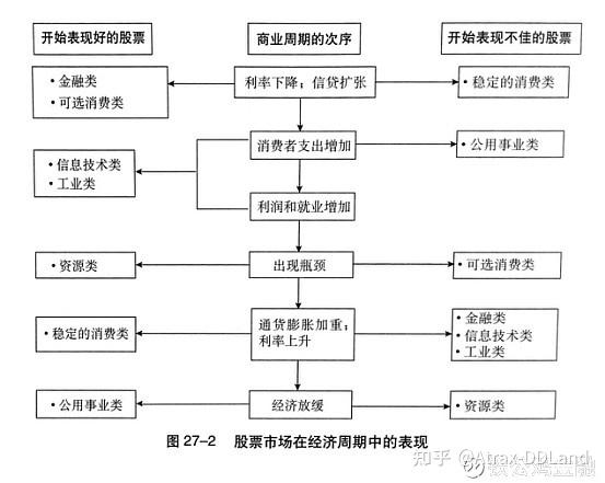股票的涨跌往往要比债券滞后一些,而作者讲到平均而言在经济是达到顶峰之前大约9个月的时候,股票市场已经达到顶峰,而当低处于低谷时,股票市场反转上升的时间平均要比经济低谷大约早5个月。由此可见,无论是高峰还是低谷,股票市场都是整体经济的领先指标,然而在其中会包括在不同类别资产范围内出现交替的现象,按主要类别的资产加以区分可以如下区分。