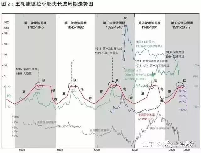 其中,康波周期里面可以分为四个小波: 繁荣、衰退、萧条、回升,也就是美林时钟的理论基础。另外一种分法也可以再细分为9个小小波:复苏、扩张、过热、爆炸、见顶回落、反弹、回落、崩溃、打底。每一个康波是指一个相当长时期的总的价格的上升或总的价格的下降。价格的长期波动不是自己产生的,而是资本主义体系本质的结果。