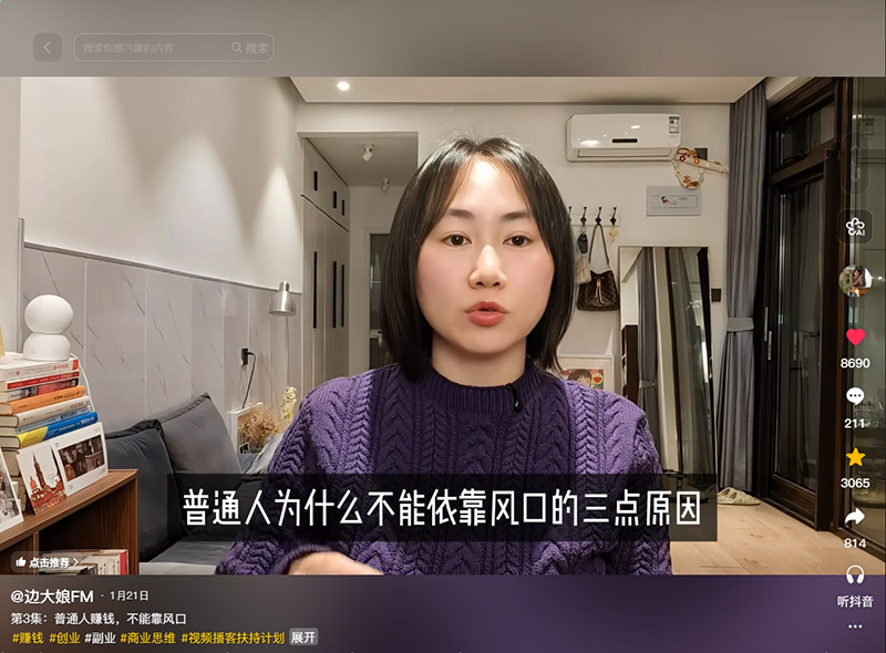 其次,从网上找大家都认可的赚钱机会,这样的信息来源也是错的。最后,凭空去网上找一个和自己没有半毛钱关系但是能赚钱的行业然后再去做,这样的流程更是错的。接下来我会分别解释以上三点原因,再来分享正确寻找机会的动作和心态到底是什么。先来解释第一点,为什么我说抓住风口就能赚钱的认知是错的? 以我自己为例,我14年初进入互联网行业做新媒体,16-17年副业做公众号和社群,16-21年副业做新媒体讲师,20-22年副业和创业做二设,24年底做视频播客,做到了现在。我身边就有人问我说,为什么你能一直踩中风口呢? 其实这个问题是本末倒置了﹗我在做之前从来没有考虑过它是不是封口﹗我也没有在网上搜索过什么是封口﹗我做这些事情是因为它们本来就符合我的专业和爱好﹗所以我愿意花时间研究,也愿意去相信。