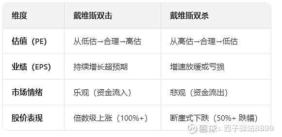 非绝对因果关系:双击 / 双杀并非必然发生,业绩增长可能被估值下跌抵消(如 “杀估值”),或估值提升消化业绩下滑(如 “戴维斯单杀”)。