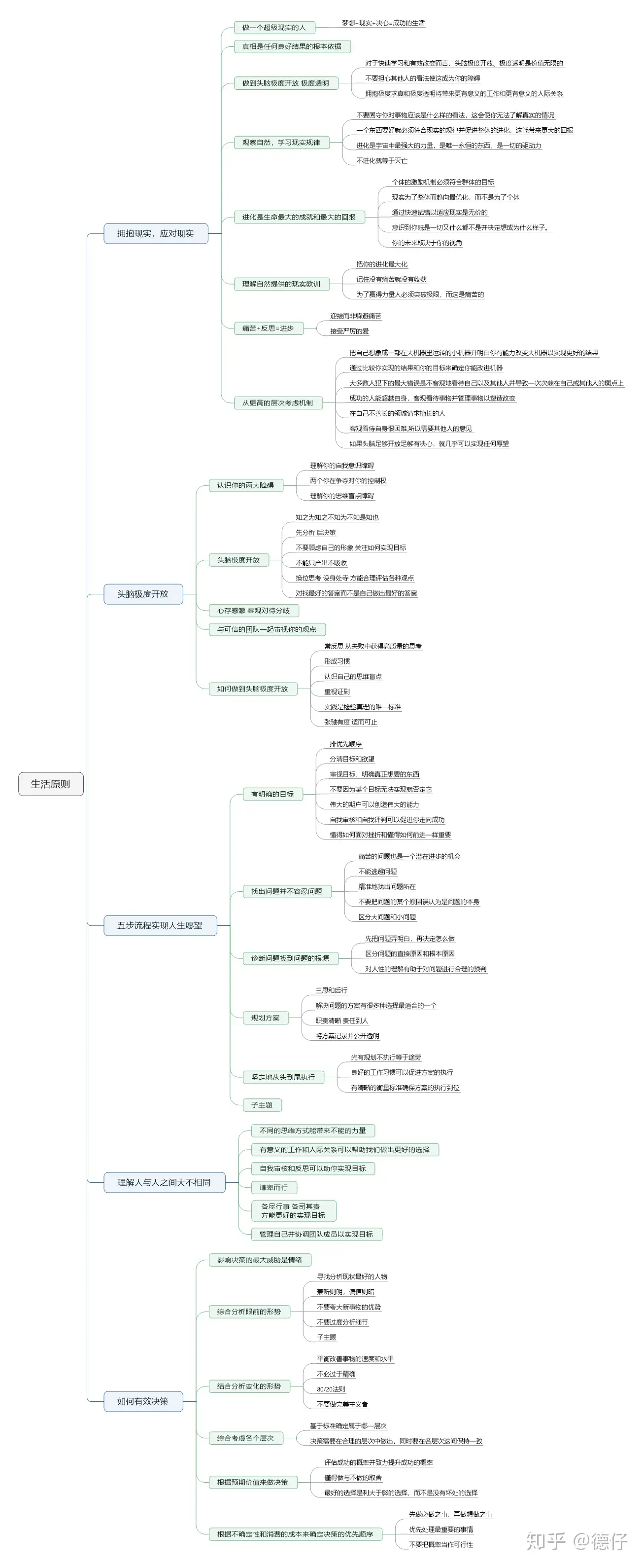 这本书我看得断断续续,终于看完了。总的来说,是一本人生路上不可多得的经验总结,我认同里面绝大部分的原则。这不是一本成功学的书,也许只有经历过风风雨雨,才能对作者总结出来的这些有所感悟。如同人类的进化一样,每一个人的人生也是一个不断进化的过程。经历得越多,就越懂得处世之道,越懂得如何努力以达到自己的目标。我整理了一下,主要是分生活原则与工作原则。生活上可能因人而异,但相信大部分的活法都是差不多的。工作上更偏向于严于律己,宽以待人,保持开放透明的心态,善于接纳不同的意见与观点。