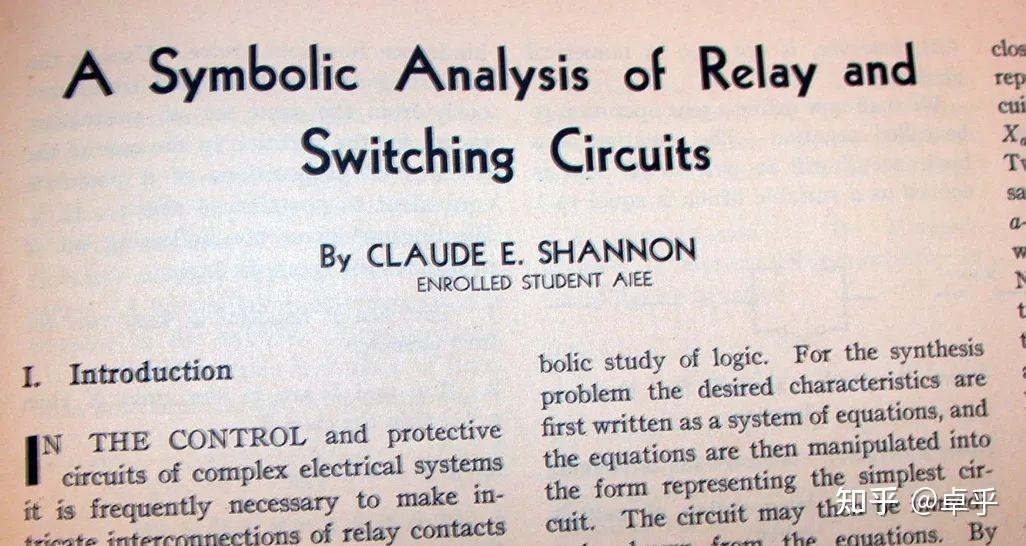 1938年,他发表了硕士论文《继电器和开关电路的符号分析》(A Symbolic Analysis of Relay and Switching Circuits)。在这篇论文中,香农证明了布尔代数和二进制算术可以简化当时在电话交换系统中广泛应用的机电继电器的设计。该论文虽只是硕士论文,但却具有划时代的意义,它完全取代了以前盛行的Ad-Hoc(点对点)方法,成为数字电路设计的理论基石。